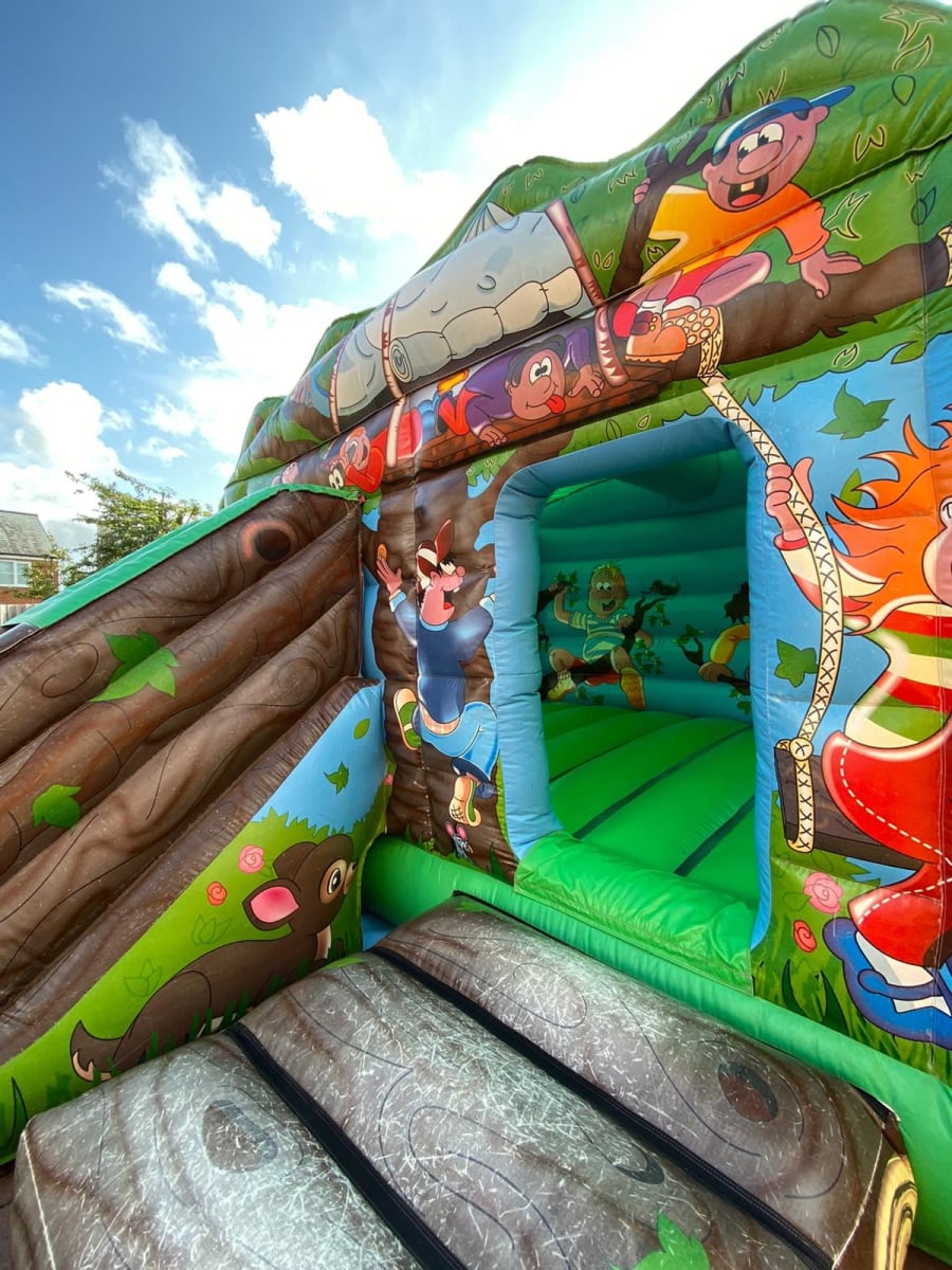 This Tree house themed bouncy castle has a slide attached so the kids can go around and around for hours! The slide does not take away from the large bouncing bed inside!