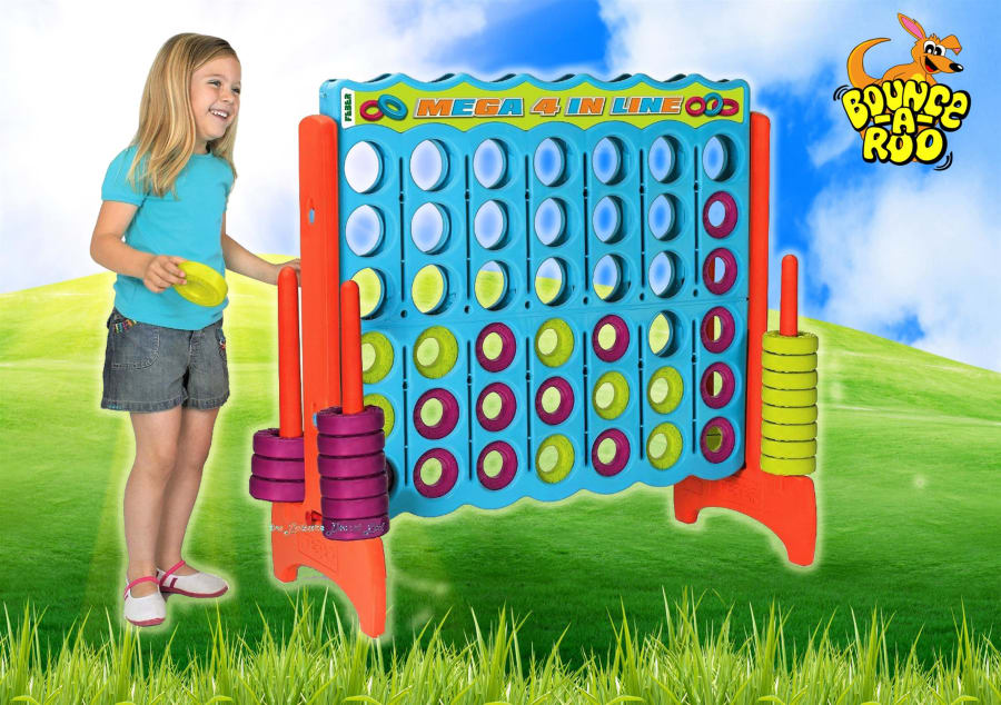 Bounce-A-Roo's hireable 'Four in a row' is the classic strategy and intelligence game for two players. However we now offer it to you as a massive garden game! Ideal for playing in the garden or at your local hall! The colourful discs are stored by colour at the sides. Age: 3+