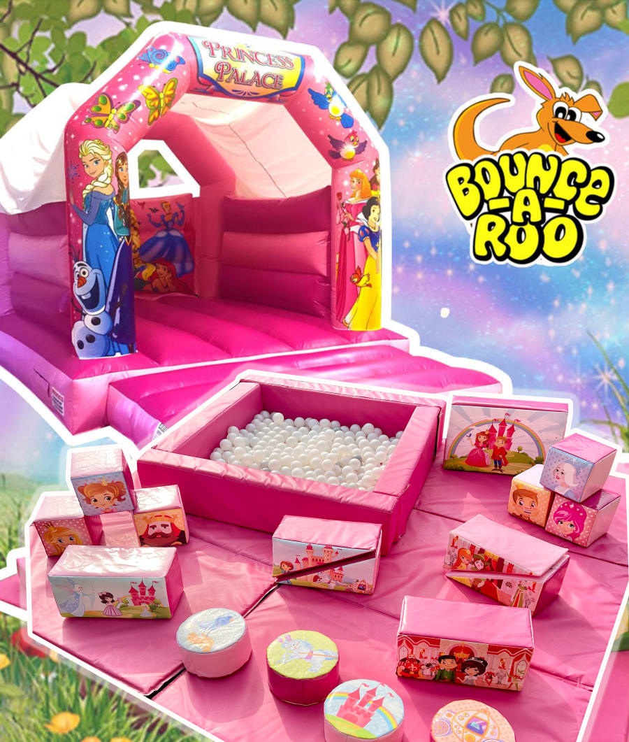 A stunning bouncy castle with all your favourite princesses on and beside it the cutest princess themed soft play!