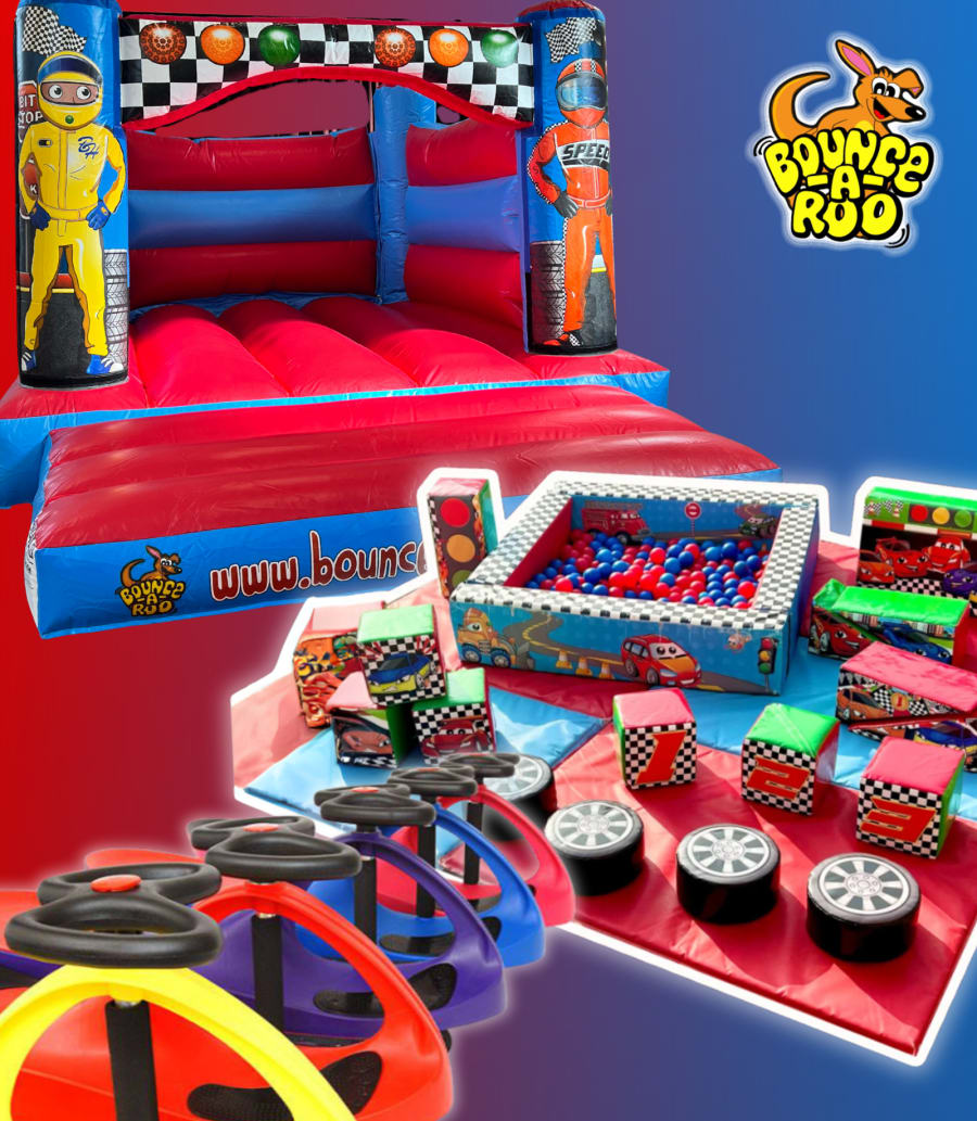 Racing Car themed Bouncy Castle with matching soft play and 5 didicars!